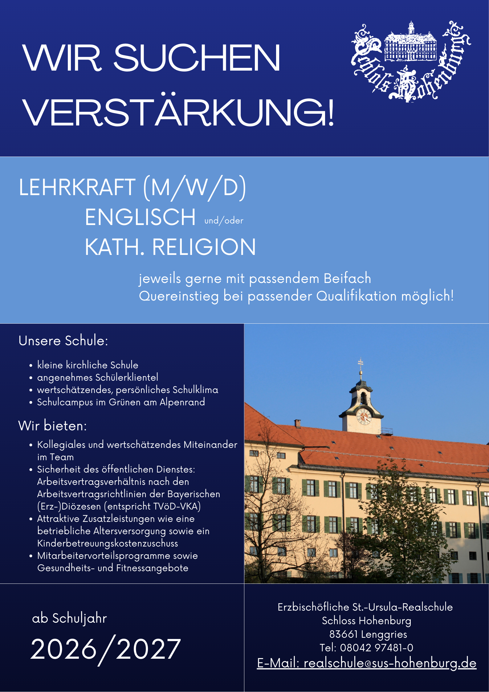Wir sind eine dreizügige staatliche anerkannte Realschule in Trägerschaft der Erzdiözese München und Freising. Ihr findet uns in Lenggries auf Schloss Hohenburg mitten im Herzen des Isarwinkels.